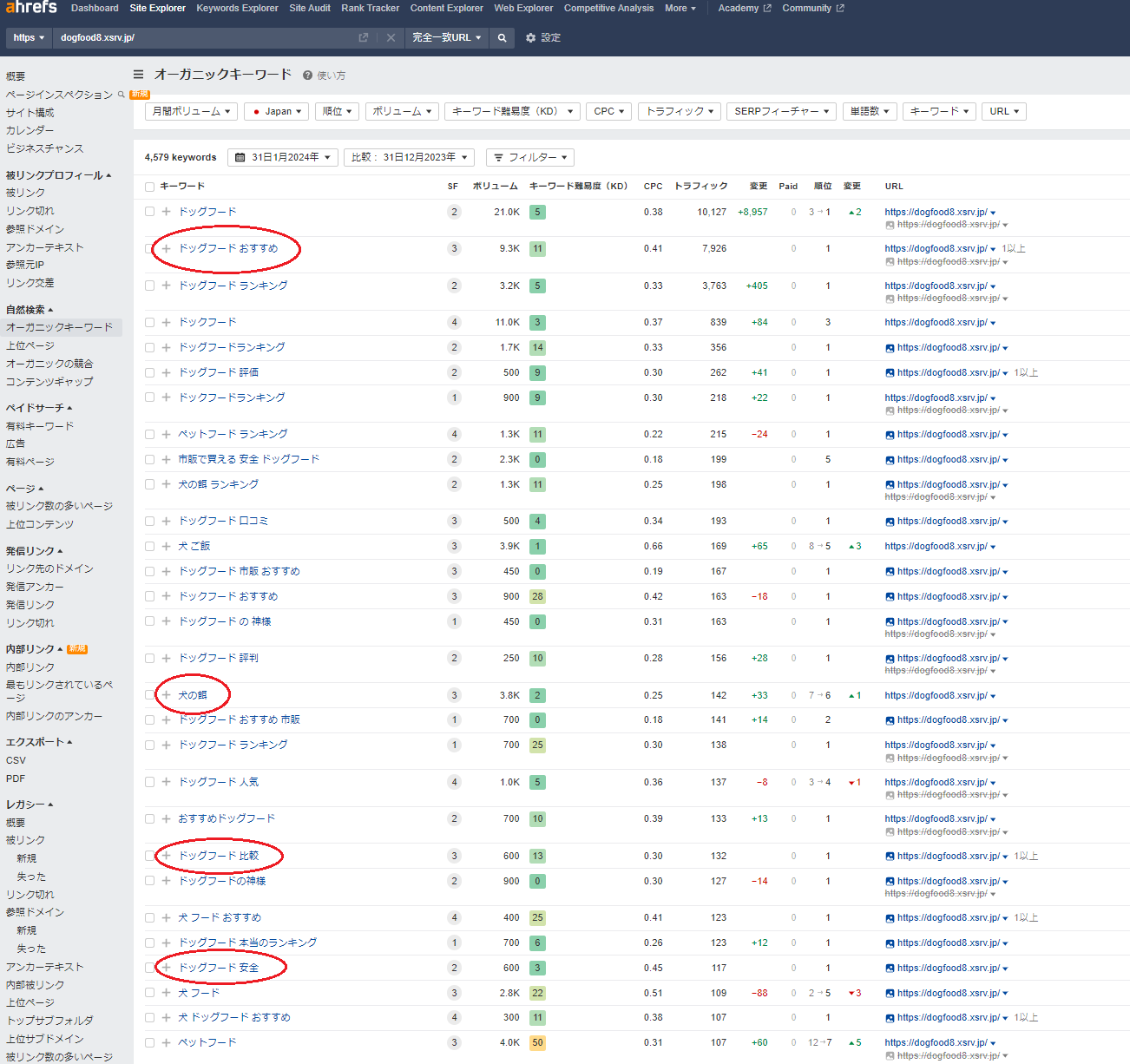 これらのキーワードをタイトルに入れてタイトルタグを組み、関連キーワードからトラフィックを得て、最終的に「ドッグフード おすすめ」で上位表示することができるようなトラフィックを稼ぐことが望ましい。