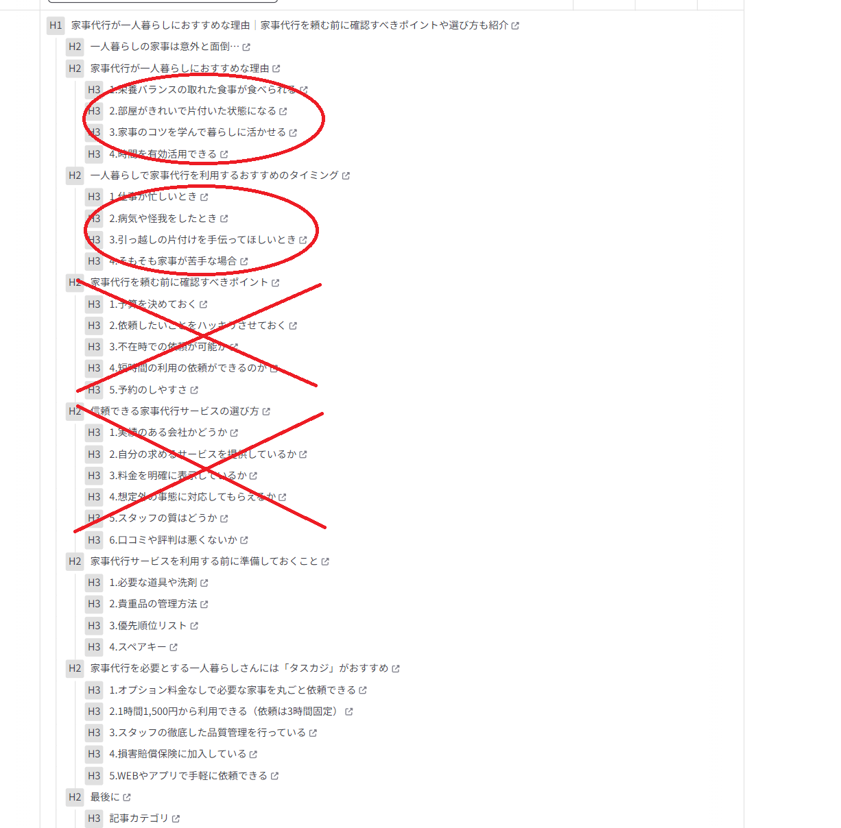 しかしペルソナ外のキーワードは記事に含めない(例えば「一人暮らし用の家事代行サービスのおすすめの記事」であれば、上位表示しているサイト内のコンテンツに共働きについての内容があったとしても除外する)。