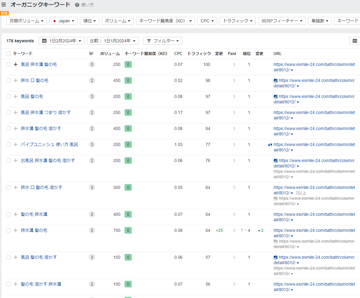 例えばターゲットキーワードが「風呂 髪の毛 溶かす」の場合、1位のサイトの最もトラフィックを得ているクエリは「風呂 排水溝 髪の毛」である。