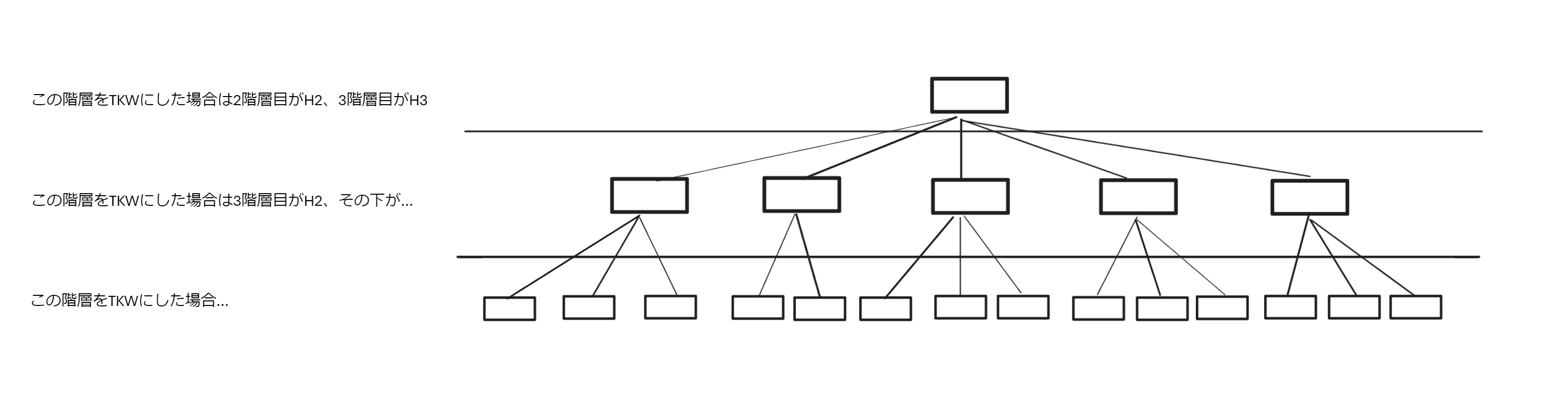 上記のようなキーワードマップを作成し、ターゲットキーワードの階層より一つ下のキーワードを狙う。